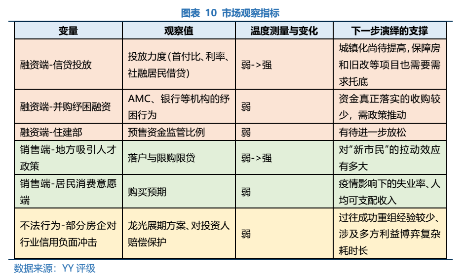 可以從市場和主體兩個維度進行觀察:一方面,結合銷售起色和融資配套感知溫度變化,另一方面,觀察出險企業(yè)紓困進展、對流動性緊張民企的外力救助以及對不法事件的問責,衡量對市場的潛在沖擊。