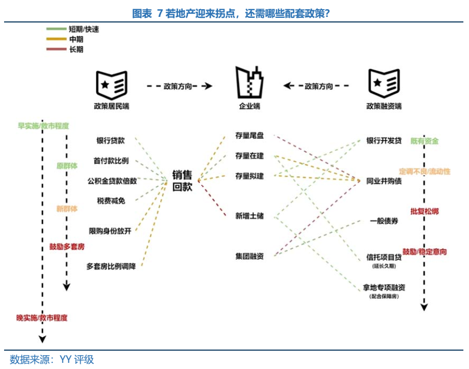 通過我們的分析,政策將會繼續(xù)在“房住不炒”定調下,從對市場有利的角度出發(fā),針對房企的銷售端、融資端出臺相關政策。基于政策推動下政策的傳導路徑,地產融資根本性改善最終還是取決于銷售的實質性扭轉。
