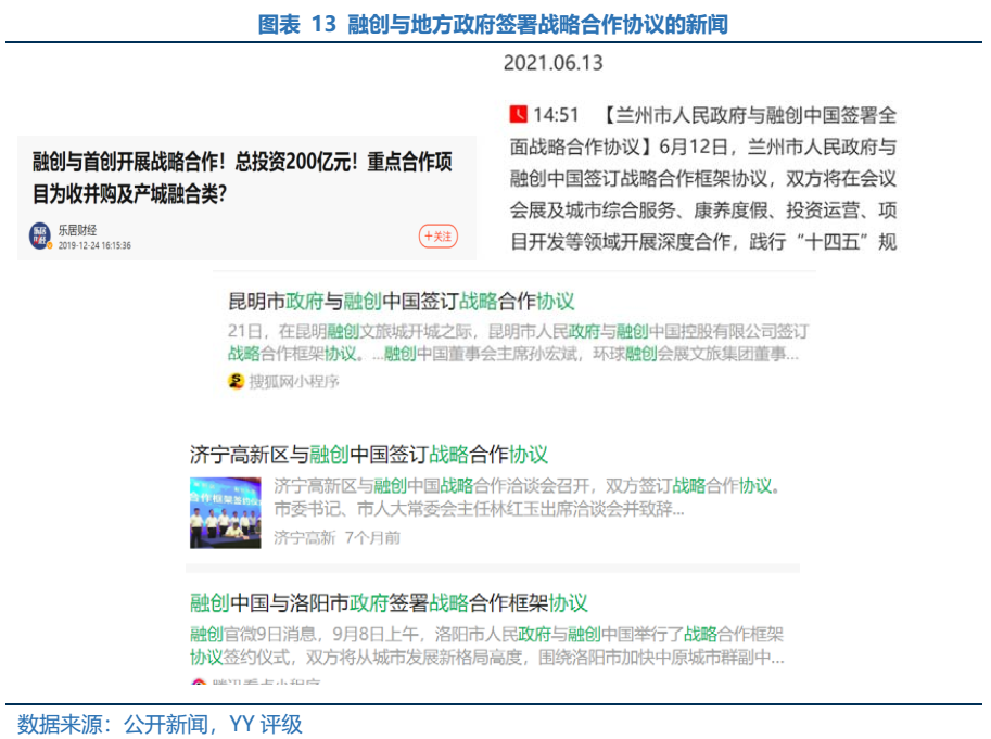 05 與地方國企合作較密切,影響范圍更廣。融創(chuàng)近年來土儲權益比在下滑,市場討論較多的也是其與地方國企合作更為密切,通過聯(lián)合營放大經營杠桿,借助合作方的力量鋪開規(guī)模,占據(jù)市場,獲得更多當?shù)刭Y源支持。根據(jù)公開新聞,融創(chuàng)與包含昆明、蘭州、洛陽、三亞、桂林等多地政府簽署戰(zhàn)略合作框架的次數(shù)要遠高于碧桂園、龍湖等企業(yè),側面反映其與地方的關聯(lián)度較深。另一方面也解釋了融創(chuàng)向央行尋求支持的行為。