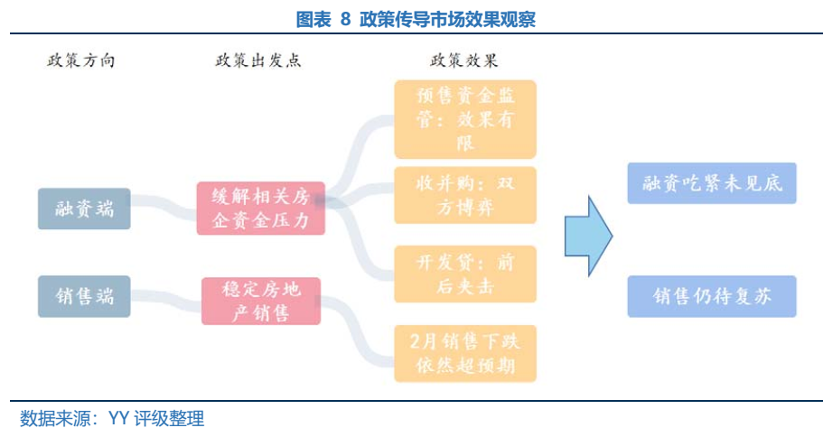 在分析政策發(fā)力路徑的基礎上,我們認為可以從融資端(信貸投放力度、參與金融機構的紓困力度、預售資金監(jiān)管比例)、銷售端(地方吸引人才效果、居民消費意愿)以及對行業(yè)不法行為整治的角度來交叉驗證回暖拐點。