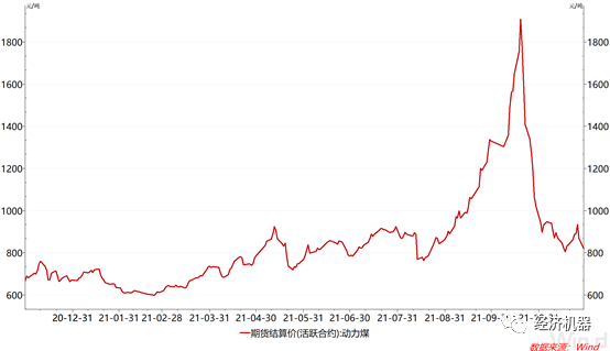 這主要得益于能源保供政策的強(qiáng)力推進(jìn),電力供應(yīng)緊張的局面有所緩解,10月份停工的企業(yè)生產(chǎn)陸續(xù)得以恢復(fù)正常。截至10月中旬,發(fā)改委已核增產(chǎn)能2.2億噸/年,預(yù)計四季度可增產(chǎn)5,000萬噸以上。此外,38座合計產(chǎn)能1億噸/年的應(yīng)急保供煤礦可階段性釋放產(chǎn)能,60余座合計產(chǎn)能1.5億噸/年以上的辦理接續(xù)用地的煤礦也有望逐步投產(chǎn)。發(fā)改委近日又發(fā)布消息稱,一系列保供穩(wěn)價措施,取得了立竿見影的成效,煤炭調(diào)度日產(chǎn)量已穩(wěn)定在 1200 萬噸以上,連續(xù)創(chuàng)歷史新高。動力煤期貨價格則由10月中旬的每噸兩千元左右降到近日的800元左右,降幅高達(dá)60%(圖2)。