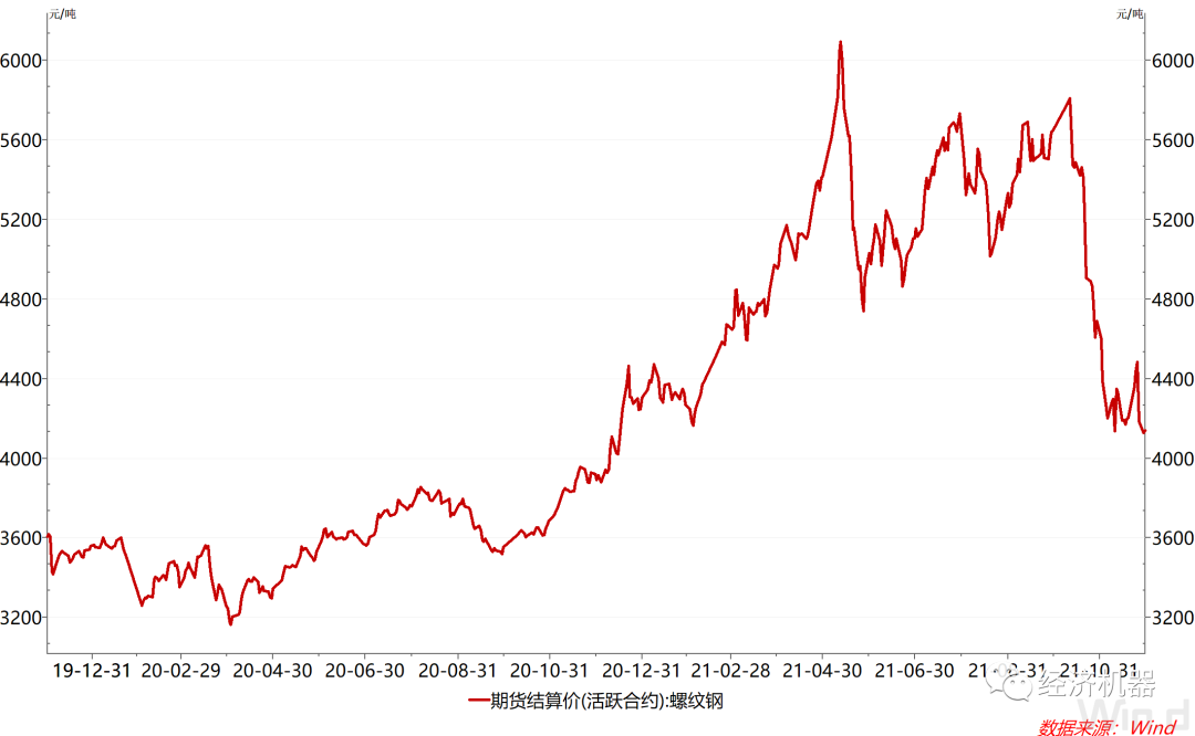生產(chǎn)領(lǐng)域價格的顯著回落也印證了限產(chǎn)沖擊的迅速消退,這不僅表現(xiàn)在煤炭采選等行業(yè),也體現(xiàn)在鋼鐵、有色、化工等各個領(lǐng)域。比如螺紋鋼期貨價格呈現(xiàn)出與動力煤類似的走勢,于10月中旬開始出現(xiàn)大幅回落(圖5)。