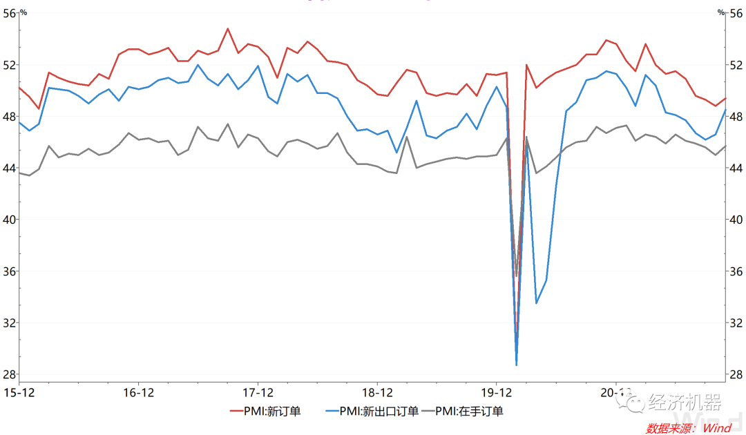 4)訂單分項改善遠(yuǎn)比生產(chǎn)等指標(biāo)小,服務(wù)業(yè)邊際惡化。11月,PMI新訂單和在手訂單指數(shù)分別為49.4%和45.7%,較上月回升0.6和0.7個百分點(圖3)。這是近半年來首次出現(xiàn)回升,但改善幅度遠(yuǎn)低于生產(chǎn)分項(+3.6pct)。非制造業(yè)商活動指數(shù)為52.3%雖然仍處于擴(kuò)張區(qū)間,但有所下滑。