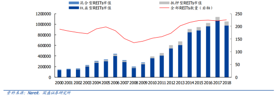 美國(guó)是全球最早發(fā)展REITs的國(guó)家,1960年美國(guó)《國(guó)內(nèi)稅收法案》和《房地產(chǎn)投資信托法案》明確了REITs的稅收結(jié)構(gòu)與法律框架,1965年,首只REITs于紐交所上市,標(biāo)志著REITs市場(chǎng)的啟動(dòng)。隨著政府允許滿足條件的REITs免征所得稅和資本利得,REITs得到快速的發(fā)展,如今美國(guó)的REITs市場(chǎng)已經(jīng)發(fā)展的很成熟了,這種成熟不僅體現(xiàn)在產(chǎn)品的設(shè)計(jì)、操作流程和信息披露,也體現(xiàn)在與REITs市場(chǎng)相對(duì)應(yīng)的法律框架的完備上。目前已經(jīng)超過(guò)30個(gè)國(guó)家引進(jìn)REITs制度并形成交易市場(chǎng)。截至3月末,美國(guó)上市REITs共225只,市值合計(jì)1.216萬(wàn)億美元。