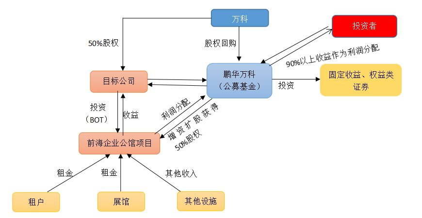 在一定意義上,前海萬(wàn)科REITs是首只公募REITs的嘗試。上市首日,基金交投活躍,成交額超過(guò)5000萬(wàn)元。發(fā)行期間單個(gè)投資者的單筆認(rèn)購(gòu)門檻為10萬(wàn)元。產(chǎn)品成立并上市后,在二級(jí)市場(chǎng)1萬(wàn)元即可參與交易。其標(biāo)的資產(chǎn)主要是萬(wàn)科前海企業(yè)公館未來(lái)8年的租金收益權(quán)。投資分為兩部分,其一是投資于目標(biāo)公司,比例不超過(guò)基金資產(chǎn)的50%;另一部分將投資于固定收益類資產(chǎn)、權(quán)益類資產(chǎn)等,比例不低于基金資產(chǎn)的50%。其中,對(duì)于目標(biāo)公司的投資是通過(guò)增資方式持有目標(biāo)公司50%的股權(quán)至2023年7月24日,由此獲取自2015年1月1日起至2023年7月24日期間前海企業(yè)公館項(xiàng)目100%的租金收益權(quán)。