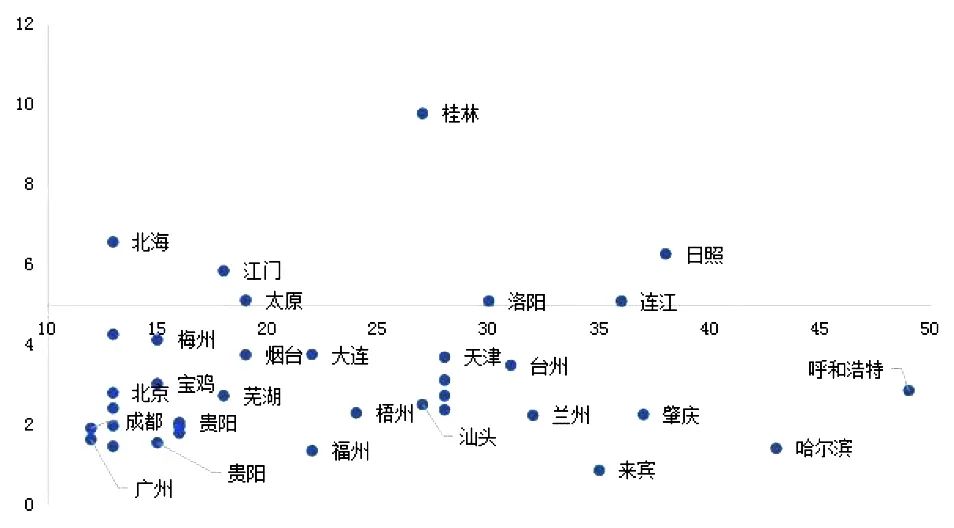 短期庫存較高城市則包括桂林、天津、洛陽、蕪湖等城,這一類城市土地消化周期均低于5年,但商品房消化周期均超過12個(gè)月,其中桂林、北海已升至40個(gè)月以上。