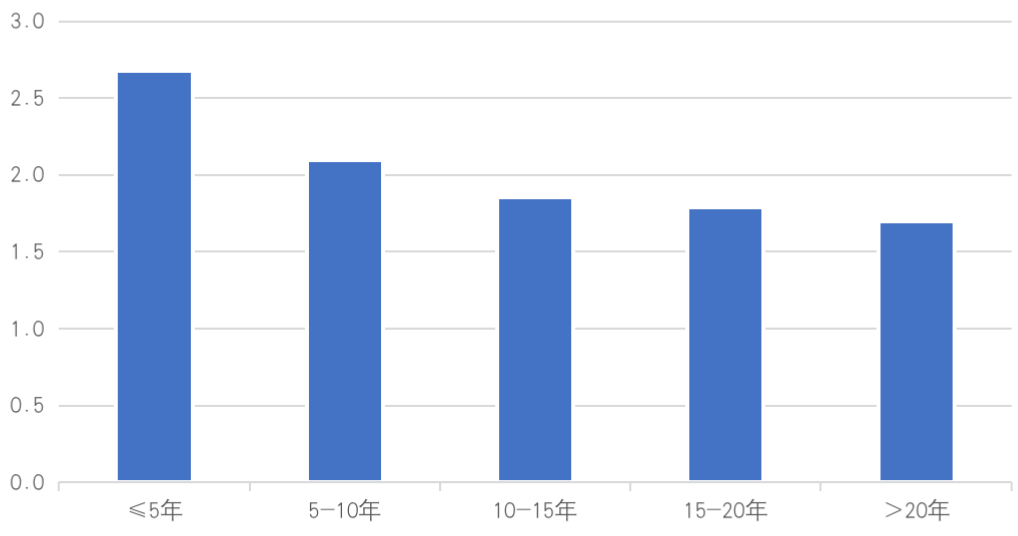 從不同樓齡段來看,樓齡5年以下的項(xiàng)目物業(yè)費(fèi)明顯高于其他樓齡段的物業(yè)費(fèi),其與5-10年樓齡項(xiàng)目的平均物業(yè)費(fèi)差距為0.6元/㎡/月,遠(yuǎn)高于5-10年樓齡與10-15年樓齡項(xiàng)目的物業(yè)費(fèi)0.2元/㎡/月的差距。10-15年樓齡與15-20年樓齡以及20年以上樓齡的物業(yè)費(fèi)差距則較為平均,都為0.1元/㎡/月。