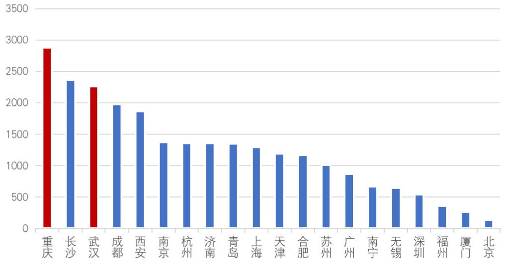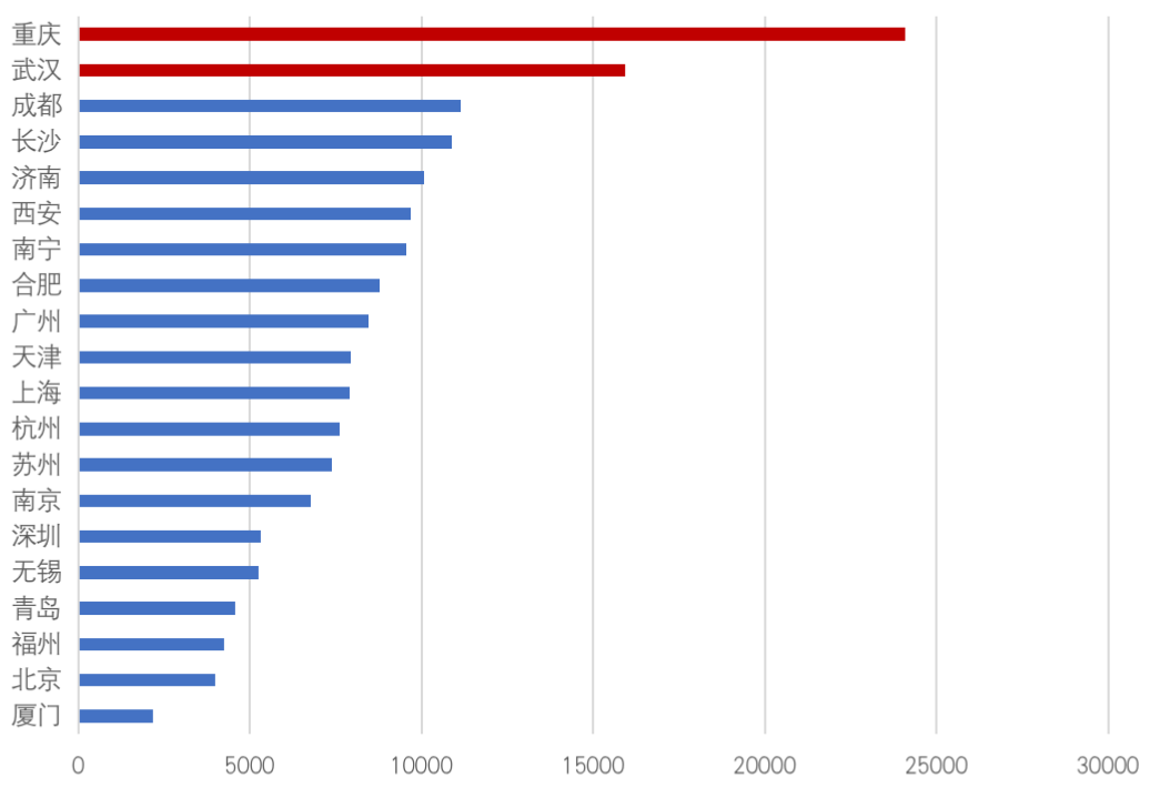 從近一年住宅用地成交規(guī)模來看,重慶、長沙、武漢、成都等中西部城市表現(xiàn)依然強(qiáng)勁,重慶成交規(guī)模2877萬平方米居首位。隨著項(xiàng)目的建設(shè)交付,我們相信,這些項(xiàng)目將在未來一年轉(zhuǎn)化為該城市企業(yè)的重點(diǎn)拓展對象。