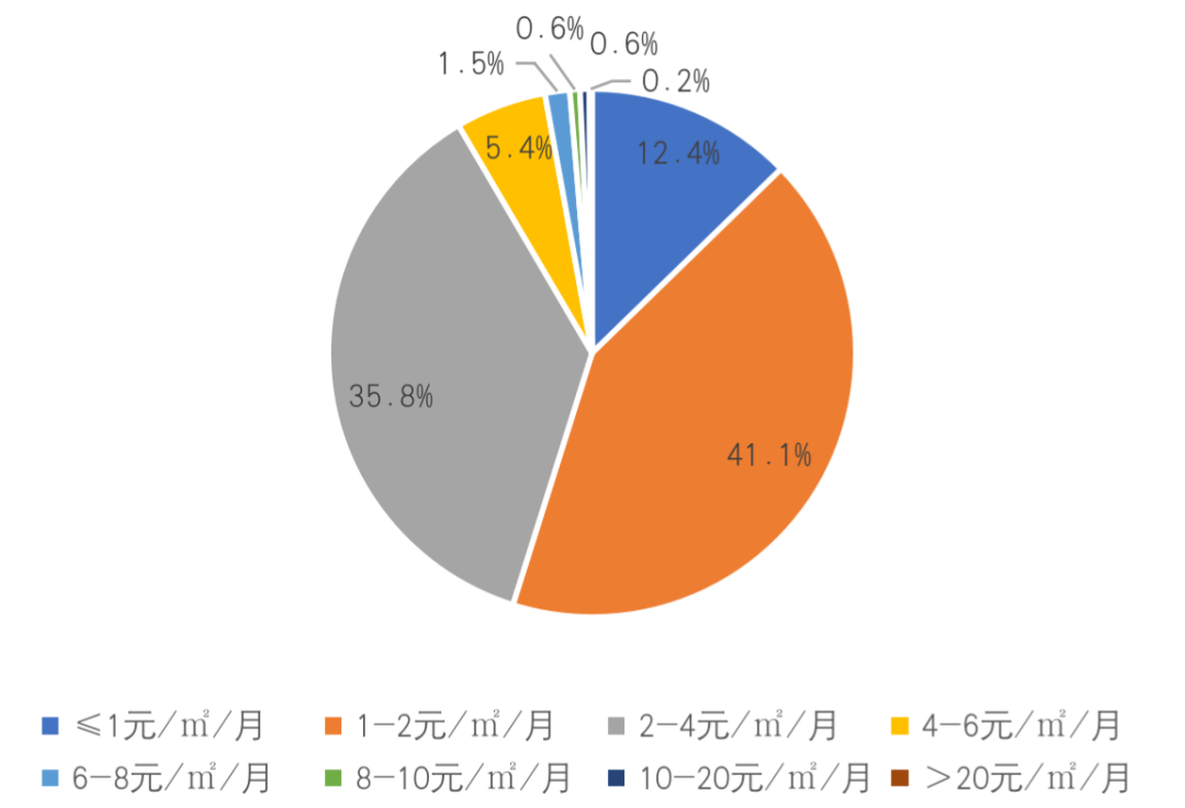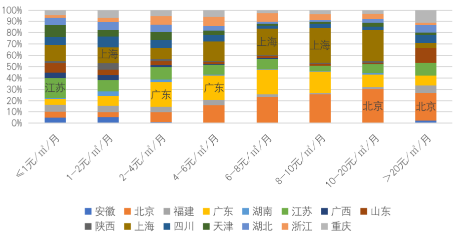 其中10-20元/㎡/月價(jià)格段中北京、上海兩市合計(jì)占比近60%,一線城市高物業(yè)費(fèi)壟斷明顯。