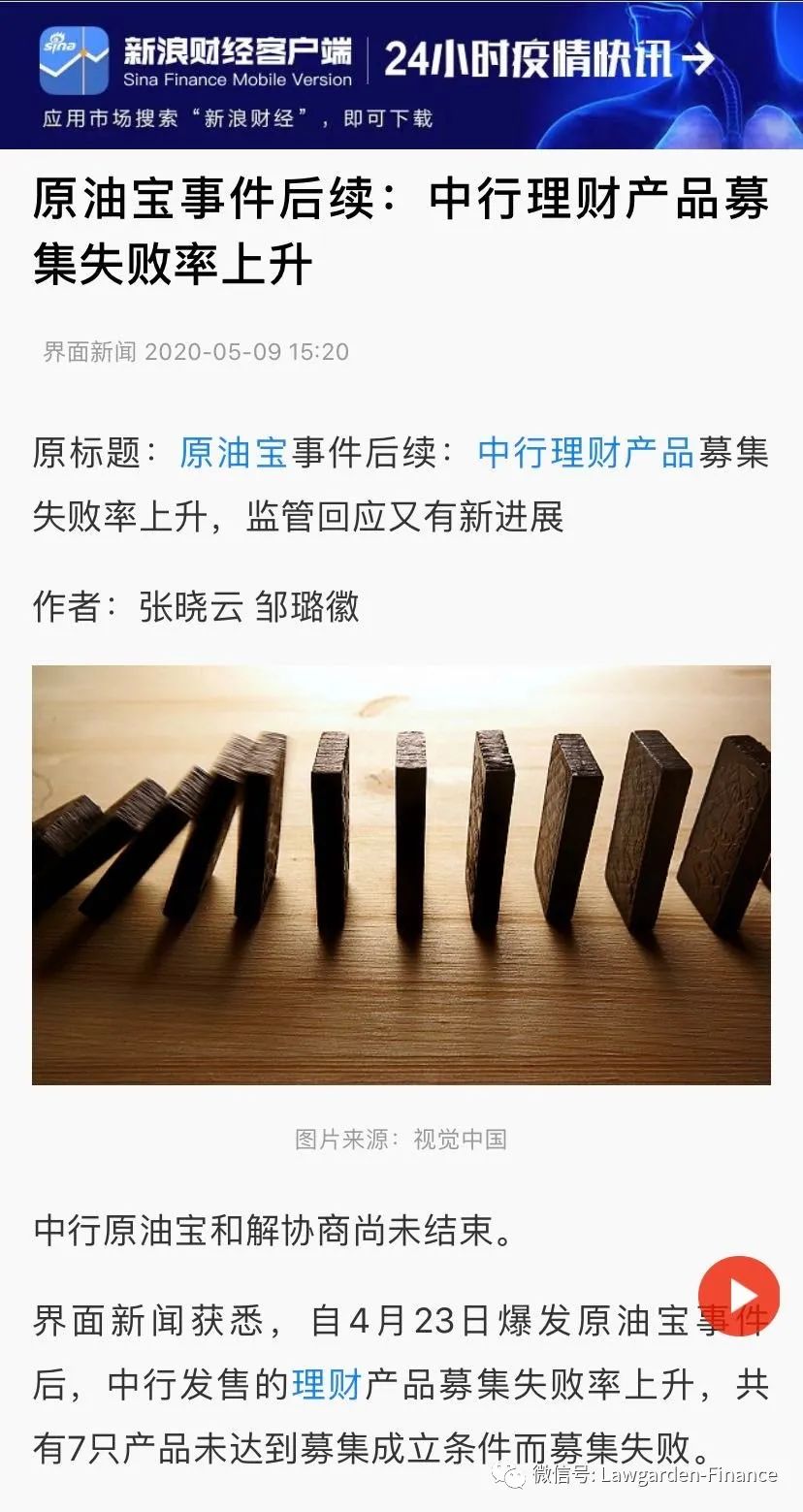 事實上,金融機構(gòu)在注重業(yè)務(wù)增長的同時,也應(yīng)給與消費者權(quán)益保護同等重視。金融消費者乃金融機構(gòu)之衣食父母,正所謂“水能載舟,亦能覆舟”。當(dāng)某行還在為蠅頭小利與客戶掰扯賠償比例的時候,殊不知該行理財產(chǎn)品的募集失敗率正在上升,據(jù)界面新聞記者發(fā)現(xiàn),自4月23日爆發(fā)原油寶事件后,該行共有7只產(chǎn)品未達到募集成立條件而募集失敗,在該新聞評論區(qū),更有留言稱已將在該行的存款轉(zhuǎn)移至其他銀行。一起消費者保護事件,可能引致整個公司信用的喪失。