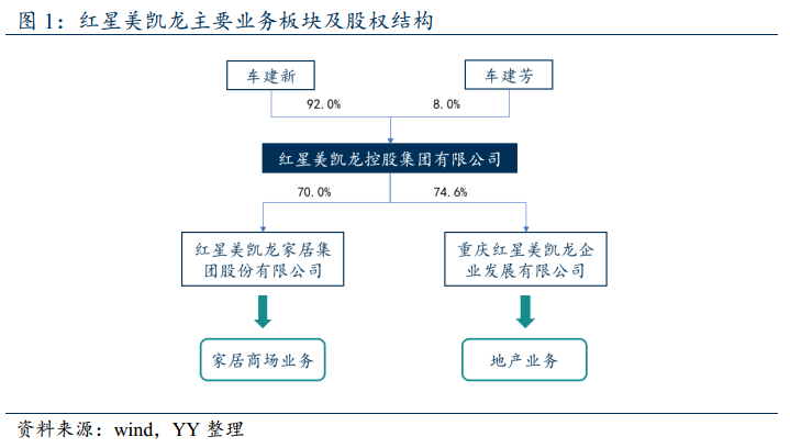 紅星美凱龍控股集團(tuán)有限公司(以下簡(jiǎn)稱“美凱龍控股”)1986年從一家家具小作坊起家,如今商場(chǎng)數(shù)量完勝萬(wàn)達(dá),成為全球“Mall王”。公司業(yè)務(wù)主要分為家居商場(chǎng)業(yè)務(wù)、商業(yè)地產(chǎn)及住宅開(kāi)發(fā)業(yè)務(wù)兩大板塊,其中家居商場(chǎng)業(yè)務(wù)主要由子公司紅星美凱龍家居集團(tuán)股份有限公司(以下簡(jiǎn)稱“美凱龍家居”)負(fù)責(zé),已經(jīng)A+H股上市。商業(yè)地產(chǎn)及住宅開(kāi)發(fā)業(yè)務(wù)主要由子公司重慶紅星美凱龍企業(yè)發(fā)展有限公司(以下簡(jiǎn)稱“紅星企發(fā)“)負(fù)責(zé)。
