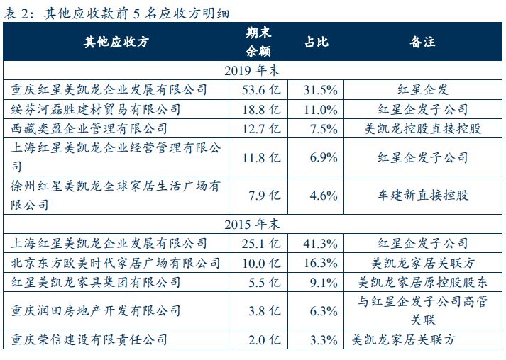則僅看前5名應(yīng)收方,2015-2019年,美凱龍控股通過(guò)其他應(yīng)收款向紅星企發(fā)新增拆借資金55億元。除前5名之外的其他應(yīng)收方?jīng)]有披露,但是從美凱龍家居2019報(bào)表來(lái)看,美凱龍家居及其納入合并范圍的子公司都沒(méi)有對(duì)美凱龍控股的其他應(yīng)付款,因此可判斷美凱龍控股并沒(méi)有通過(guò)其他應(yīng)收款將資金拆借給美凱龍家居,預(yù)計(jì)主要還是被紅星企發(fā)及其關(guān)聯(lián)方占用。