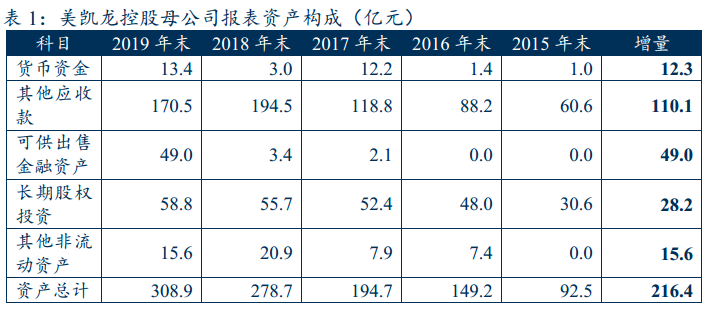 2015年末,母公司資產(chǎn)規(guī)模不到100億,至2019年末已經(jīng)超過(guò)300億,期間負(fù)債規(guī)模更是從55億飆升至243億,翻了4倍,負(fù)債率從59.5%增長(zhǎng)至78.9%,擴(kuò)張十分迅猛。從資產(chǎn)構(gòu)成來(lái)看,貨幣資金、其他應(yīng)收款、可供出售金融資產(chǎn)、長(zhǎng)期股權(quán)投資、其他非流動(dòng)資產(chǎn)五個(gè)科目的規(guī)模占總資產(chǎn)規(guī)模比例基本在99%以上。