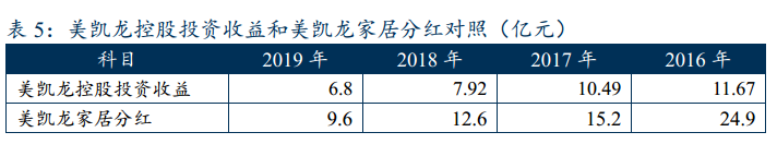 公司未分配利潤(rùn)主要來(lái)源于投資收益,除了2019年自身經(jīng)營(yíng)業(yè)務(wù)虧損3億元以外,其他年度營(yíng)業(yè)收入基本能覆蓋利息費(fèi)用,凈利潤(rùn)主要來(lái)源于投資收益。2016年至2019年,公司分別獲得投資收益11.7億元、10.5億元、7.9億元、6.5億元,沒(méi)有披露相關(guān)明細(xì),但是通過(guò)與美凱龍家居歷年的現(xiàn)金分紅情況相較,按70%左右持股比例,可知除2016年以外,每年的投資收益基本都與美凱龍家居的分紅相匹配。但這些年中僅2019年對(duì)美凱龍家居增加投資1億元,則總體來(lái)看從美凱龍家居方凈獲取資金達(dá)40億元左右。此外,其他應(yīng)收款方面也在逐步收回對(duì)美凱龍家居的拆借,考慮上這個(gè)部分未來(lái)從美凱龍家居會(huì)逐步有些回收。