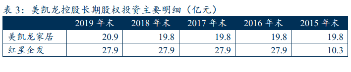 長(zhǎng)期股權(quán)投資方面,2019年末,美凱龍家居和紅星企發(fā)合計(jì)占比約83%。2016年,美凱龍控股對(duì)紅星企發(fā)增加投資17.6億元,而對(duì)美凱龍家居僅在2019年增加投資1億元。