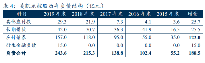 則經(jīng)過(guò)對(duì)融資歷史的梳理以及一年內(nèi)到期非流動(dòng)負(fù)債重分類,可分析出從2015年末至2019年末,公司通過(guò)債券凈融資約137億元(不含出表ABS,可交債15億權(quán)益部分計(jì)入衍生金融工具),長(zhǎng)期借款新增約12億元,其他應(yīng)付款新增26億元。主要是依賴資本市場(chǎng)實(shí)現(xiàn)了舉債目的。