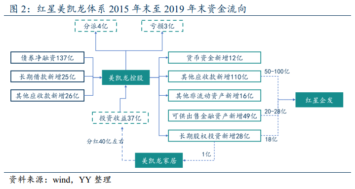 因此簡(jiǎn)單來(lái)看,從2016年至2019年,母公司在資本市場(chǎng)發(fā)行債券凈融資137億元(不含出表ABS,含可交債),新增長(zhǎng)期借款25億元,新增其他應(yīng)付款26億元,投資收益37(其中獲得美凱龍家居分紅40億左右),對(duì)應(yīng)資產(chǎn)來(lái)看,則是形成貨幣資金12億元,其他應(yīng)收款110億元(紅星企發(fā)占比50%以上),可供出售金融資產(chǎn)49億,長(zhǎng)期股權(quán)投資28億(其中紅星企發(fā)18億,美凱龍家居1億),其他非流動(dòng)資產(chǎn)16億,此外,自身經(jīng)營(yíng)業(yè)務(wù)還虧損掉了3億左右,分紅在4億左右。