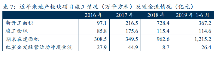 從現(xiàn)金流來(lái)看,由于近兩年項(xiàng)目去化情況較好,在2016年、2017年經(jīng)營(yíng)活動(dòng)大額凈流出之后,2018年、2019年紅星企發(fā)都實(shí)現(xiàn)了經(jīng)營(yíng)活動(dòng)現(xiàn)金流凈流入。不過(guò)公司2018年、2019年新開(kāi)工面積很大,目前在建工程規(guī)模依然高企,截至19年6月末,公司在建項(xiàng)目52個(gè),總投資額為1,220.3億元,已完成投資額 537.1億元,尚需投資約700億元。雖然公司采用滾動(dòng)開(kāi)發(fā)的方式能夠減輕資本支出壓力,但是如果出現(xiàn)銷售回款不順的情況,公司將騎虎難下,因此在建項(xiàng)目實(shí)際還是會(huì)構(gòu)成資本支出壓力。