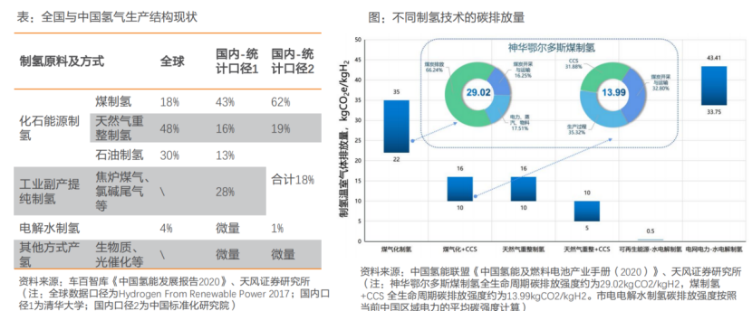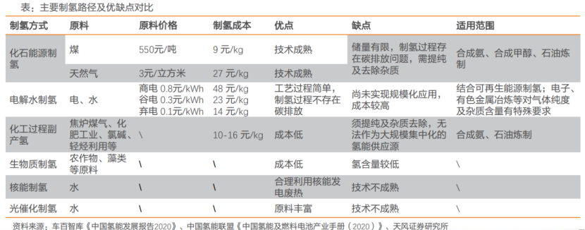 現(xiàn)階段較為成熟的制氫的技術(shù)路線有三種:一是以煤炭、天然氣為代表的化石能源重整制氫,俗稱藍(lán)氫;二是以焦?fàn)t煤氣、氯堿尾氣、丙烷脫氫為代表的工業(yè)副產(chǎn)氣制氫,俗稱灰氫;三是電解水制氫,俗稱綠氫。
