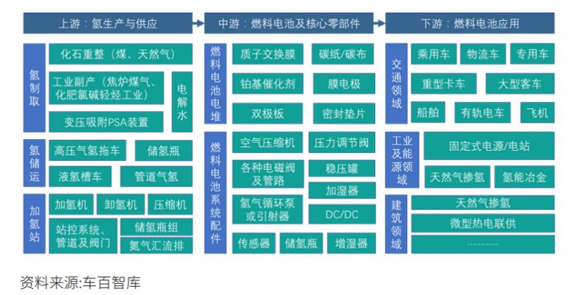 按照產(chǎn)業(yè)鏈由上到下的次序,氫能源產(chǎn)業(yè)鏈可以分成三段,上游是氫生產(chǎn)與供應(yīng);中游,是燃料電池及核心零部件,而它的下游,則是燃料電池應(yīng)用。