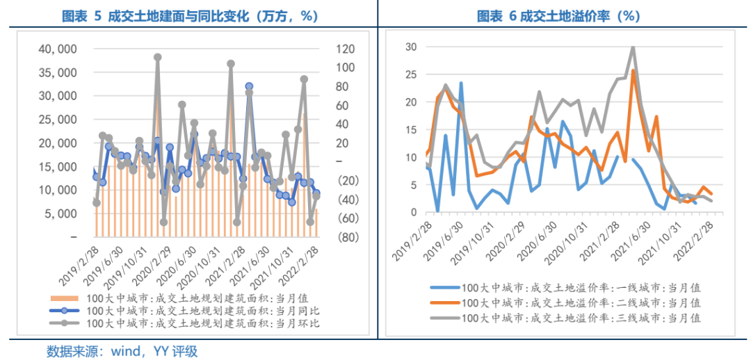 根據(jù)銷售-拿地-開工投資的經(jīng)營流程鏈條,在銷售大幅下滑的情況下土地市場同樣降溫顯著。22年2月份百城土地成交建面6846.6萬方,當(dāng)月同比和環(huán)比分別為-33.4%、-36.8%。一方面由于2月春節(jié)因素,土地供應(yīng)規(guī)模有所下滑,另一方面從成交土地溢價(jià)率看,疫情和經(jīng)濟(jì)放緩周期下土拍市場表現(xiàn)冷清,二三線土地溢價(jià)率繼續(xù)回落。后續(xù)隨著土地供應(yīng)在3-4月份集中出讓,土地成交建面料會(huì)有所抬升,但實(shí)質(zhì)拿地?zé)崆槎鹊幕厣€需結(jié)合銷售、市場預(yù)期、企業(yè)盈利等。