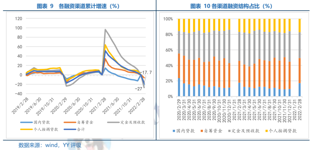 融資負(fù)債端看,資金來源規(guī)模收縮表現(xiàn)出較大的不穩(wěn)定性。22年1-2月資金來源同比下降17.7%,較21年1-12月-21.9pct。具體渠道看,貸款、自籌資金、預(yù)收款和個(gè)人按揭分別同比-21.1%、-6.2%、-27.0%和-16.9%,分別較21年1-12月-8.4pct、-9.4pct、-38.2pct和-24.9pct。其中受銷售持續(xù)大幅下滑的影響,資金來源占比最大的經(jīng)營性回款(即預(yù)收款和個(gè)人按揭)下滑幅度最大,其次為自籌和銀行貸款。資金鏈壓力仍在加劇,銀行、信托等抽貸部分民企,再融資市場幾乎冰封,進(jìn)一步讓更多投資者選擇撤回,負(fù)循環(huán)加速。