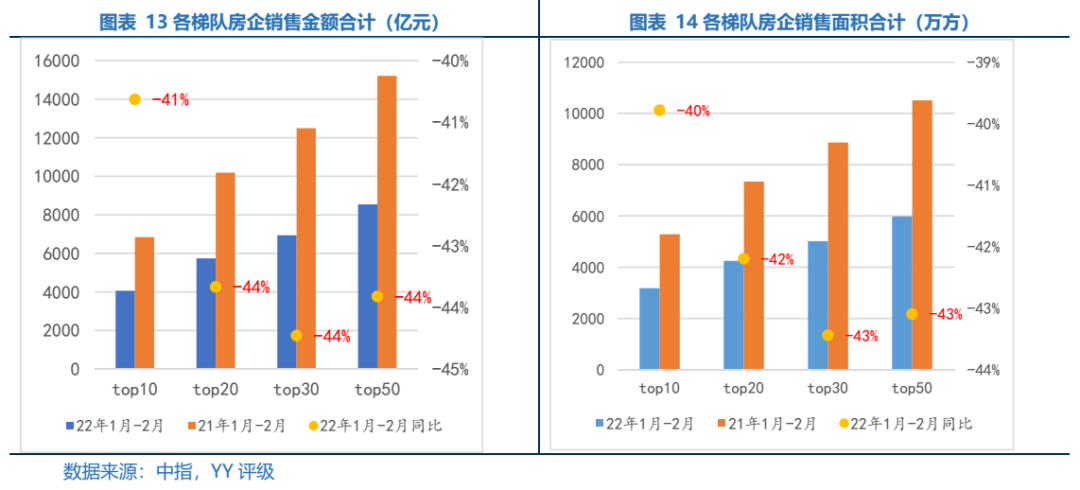 2022年1-2月全國TOP50銷售額同比下滑嚴(yán)重,但集中度圍繞著TOP10房企提高。集中度方面,TOP10銷售額占TOP50銷售額之比為47.55%,較去年同期上升了2.56%;銷售額方面,整體梯隊(duì)均下滑了約40%左右;銷售面積方面,整體梯隊(duì)亦下滑了40%左右。