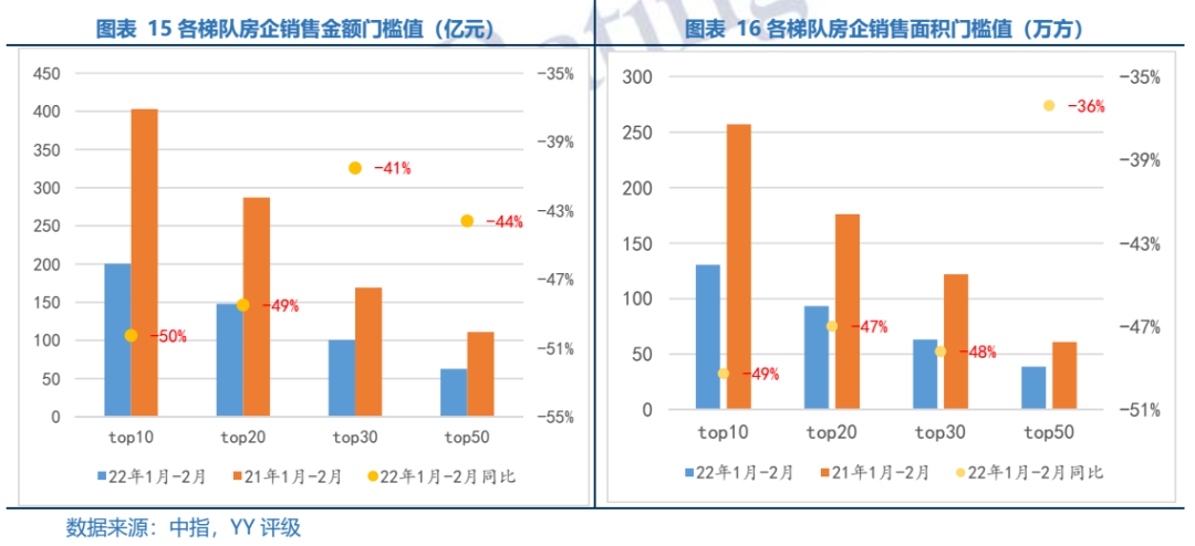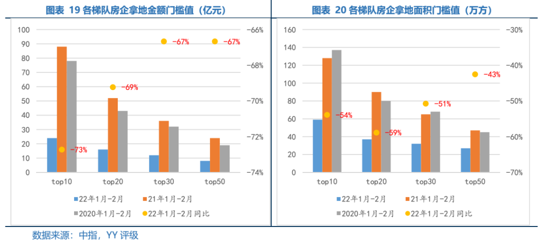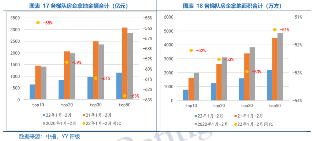2022年1-2月全國TOP50房企各梯隊(duì)拿地金額門檻同比下滑幅度均超43%,top10拿地面積僅59萬平方米,下滑了54%、top20拿地面積僅32萬平方米,下滑了59%、top30拿地面積僅27萬平方米,下滑了51%和top50拿地面積僅21萬平方米,下滑了43%。