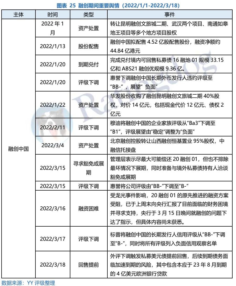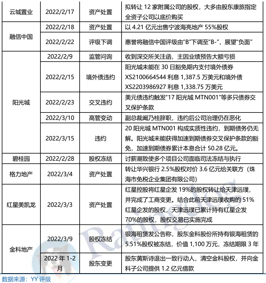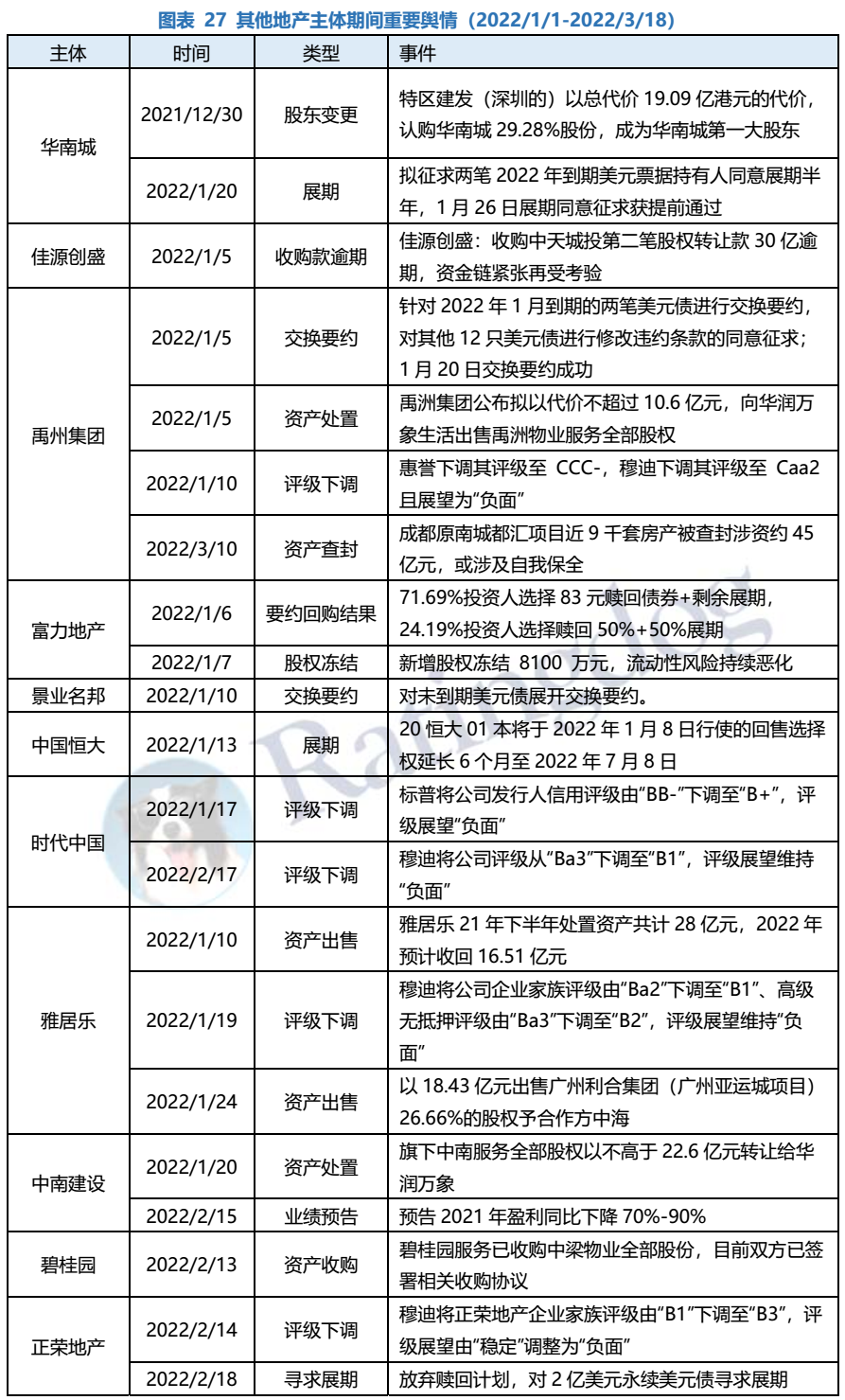 整體來看,2022年1月1日-3月18日,在行業(yè)銷售下行、外部評級(jí)下調(diào)及再融資受困等多重不利因素之下,各地產(chǎn)民企招式盡出,但仍止不住負(fù)面輿情發(fā)酵,違約/展期已由高杠桿弱資質(zhì)主體蔓延至此前市場認(rèn)為相對資質(zhì)尚可的主體,。