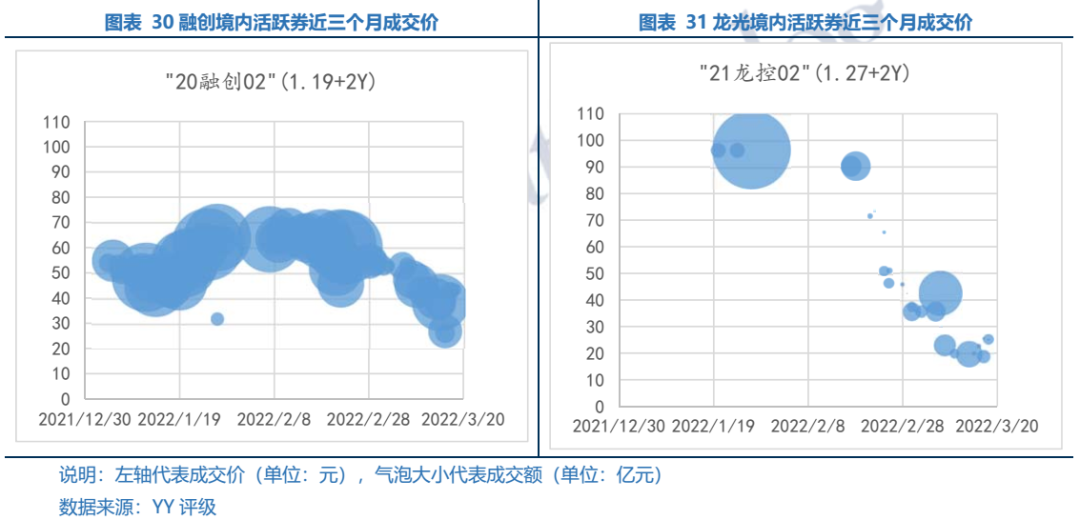 我們選取碧桂園、旭輝、融創(chuàng)和龍光期限相近的境內(nèi)債券,觀察2022/1/1-2022/3/18期間成交情況,不同資質(zhì)主體價(jià)格分層明顯。“21旭輝03”成交在94元以上;受龍光展期事件影響,“20碧地01”遭砸盤,價(jià)格由95元以上跌至87元。因債券展期消息,融創(chuàng)和龍光境內(nèi)債遭血洗,其中“20融創(chuàng)02”被大量拋售,價(jià)格跌至30元以下,“21龍控02”價(jià)格最低被砸至20元以下。