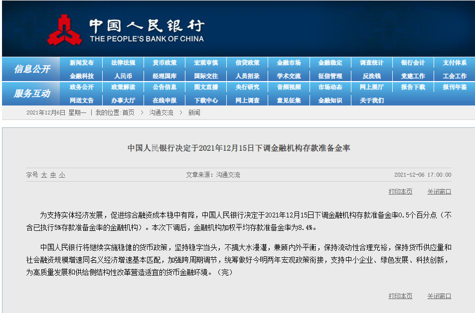 周一17:00:00,央行官網(wǎng)整點掛出了下調(diào)金融機構(gòu)存款準備金率的新聞。