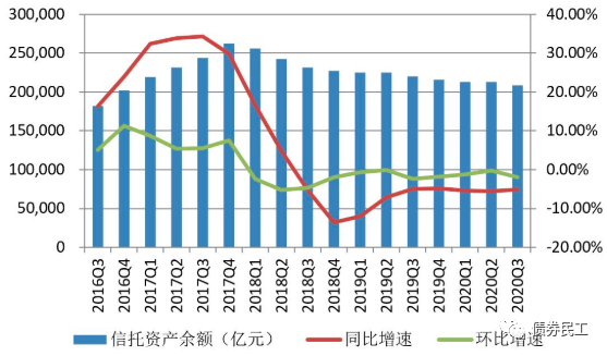 根據(jù)中國信托業(yè)協(xié)會(huì)的官方數(shù)據(jù),截至2020年3季度末,信托業(yè)受托管理的信托資產(chǎn)余額為20.86萬億元,較年初減少7,432.79億元,同比下降5.16%;信托資產(chǎn)余額較2季度末減少4,182.31億元,環(huán)比下降1.97%。國內(nèi)的信托資產(chǎn)規(guī)模已經(jīng)是連續(xù)第11個(gè)季度下降。