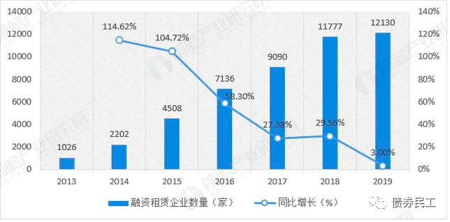 根據(jù)租賃聯(lián)合研發(fā)中心會(huì)同中國租賃聯(lián)盟、天津?yàn)I海融資租賃研究院組織編寫的《2019中國租賃業(yè)發(fā)展報(bào)告》,2019年中國融資租賃企業(yè)(不含單一項(xiàng)目公司、分公司、SPV公司、港澳臺當(dāng)?shù)刈赓U企業(yè)和收購海外的企業(yè))總數(shù)約為 12130家,較上年增加了353家,增幅約為3%。從增幅數(shù)據(jù)可以看出,融資租賃行業(yè)的數(shù)量幾乎是呈現(xiàn)斷崖式下跌。而最新的截至2020年6月底,全國融資租賃企業(yè)總數(shù)約為12151家,較上年底增加了21家,增幅只有 0.17%。