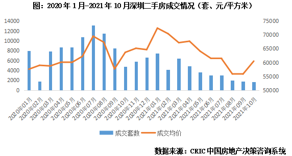 深圳二手房市場(chǎng)更為慘淡,成交規(guī)模斷崖式下跌,成交均價(jià)持續(xù)走低。8-10月,深圳二手房成交量不足2千套,僅為去年同期的兩成左右,成交均價(jià)已下滑至2019年全年平均線附近。