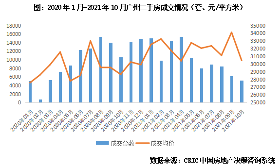 受到增值稅征免年限調(diào)整、房貸額度管控等影響,5月以來,廣州二手房成交量拾級(jí)而下。4月,廣州市9區(qū)住宅銷售增值稅征免年限由2年提高至5年,增加了二手房交易成本,導(dǎo)致5月以來掛牌量顯著下降,6月二手房成交罕見跌破1萬套,同比驟降34%,8月末廣州發(fā)布二手房指導(dǎo)價(jià),9月二手房成交量應(yīng)聲下跌,僅為6191套,同、環(huán)比分別下滑56%和27%,10月,二手房成交環(huán)比繼續(xù)跌16%。