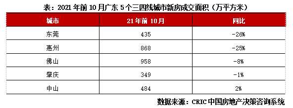 廣東其他三四線城市前10月新房成交跌多漲少,東莞、惠州累計(jì)跌幅超過25%。5個(gè)廣東城市中,除中山前10月新房成交同比微增2%外,其余4個(gè)城市成交規(guī)模均不及去年同期,東莞、佛山、東莞累計(jì)跌幅居前,作為環(huán)廣深城市,其市場(chǎng)走勢(shì)也和核心城市有所趨同。