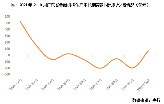 視角延伸到廣東全省,10月廣東居民中長期貸款同比止跌回升,但反彈幅度較為有限。具體而言,2021年10月,廣東住戶部門中長期貸款增加651億元,環(huán)比少增117億元,同比多增67億元,一改6月以來連續(xù)4個(gè)月同比少增的走勢(shì),但反彈幅度仍然比較有限。