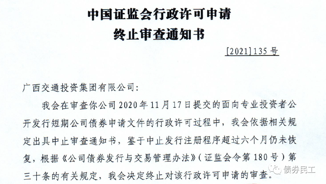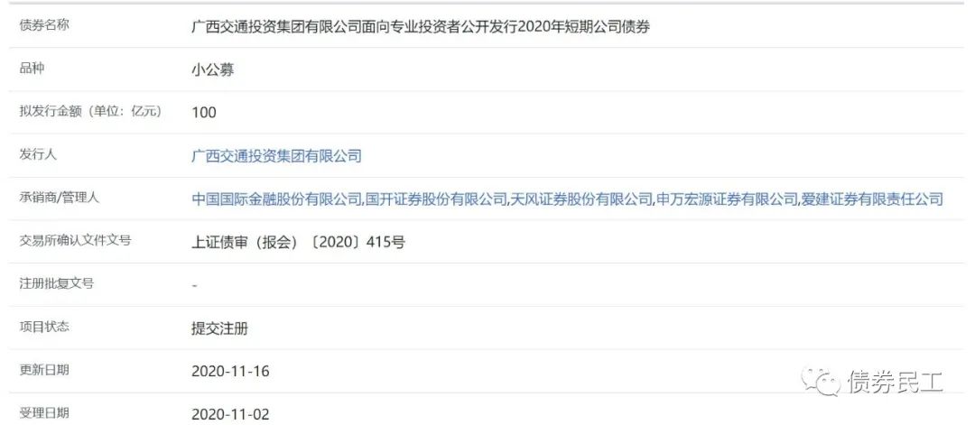 1、廣西交通投資集團(tuán)有限公司于2020年11月17日提交的面向?qū)I(yè)投資者公開發(fā)行2020年短期公司債券被終止,擬發(fā)行金額為100億元。廣西交通投資集團(tuán)有限公司的實(shí)際控制人為廣西壯族自治區(qū)國資委,主體信用評(píng)級(jí)為AAA(中誠信國際、大公國際和聯(lián)合資信),目前存續(xù)債券金額為244.70億元,存續(xù)債券只數(shù)20只,存續(xù)債券產(chǎn)品包括公司債券、企業(yè)債券、債務(wù)融資工具和境外債。
