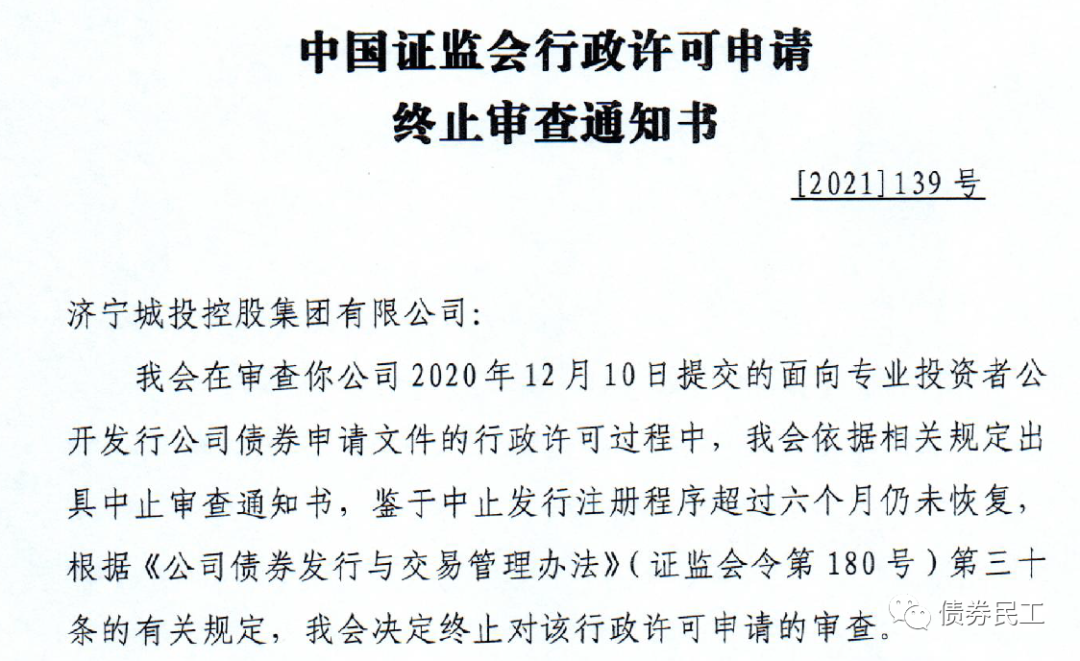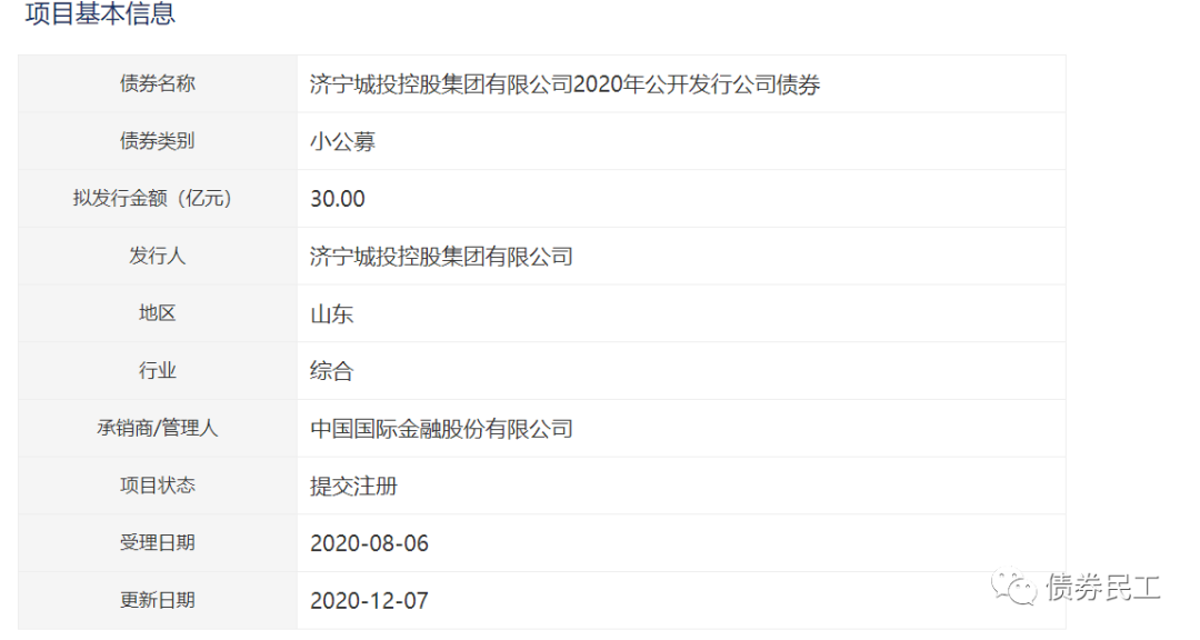 2、濟(jì)寧城投控股集團(tuán)有限公司于2020年12月10日提交的面向?qū)I(yè)投資者公開發(fā)行公司債券被終止,債券擬發(fā)行金額為30億元。濟(jì)寧城投控股集團(tuán)有限公司的實(shí)際控制人為濟(jì)寧市國資委,主體信用評(píng)級(jí)為AA+(中誠信國際、大公國際和中證鵬元),目前存續(xù)債券金額為154.50億元,存續(xù)債券只數(shù)17只,存續(xù)債券產(chǎn)品包括公司債券、企業(yè)債券和債務(wù)融資工具。