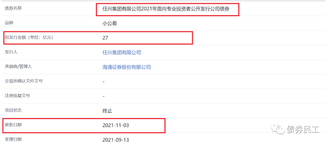 就在2021年11月3日,濟(jì)寧市另一城投公司——任興集團(tuán)有限公司申報(bào)的總額為27億元的小公募公司債券被上交所終止。任興集團(tuán)有限公司的實(shí)際控制人為濟(jì)寧市任城區(qū)國有資產(chǎn)運(yùn)營服務(wù)中心,目前存續(xù)債券金額64億元,存續(xù)債券9只,存續(xù)債券產(chǎn)品為私募債和PPN。