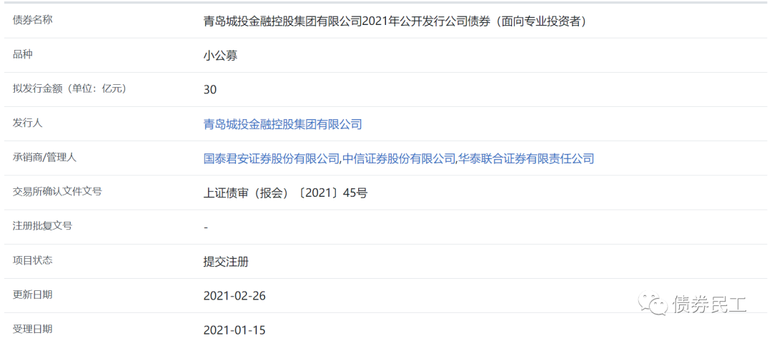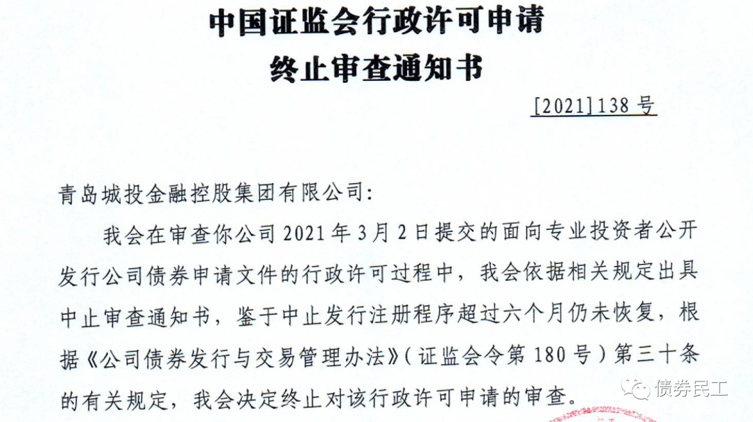 上述終止的公司債券項(xiàng)目中,值得關(guān)注的是青島城投金融控股集團(tuán)有限公司,2021年3月2日申報(bào)的2021年公開發(fā)行公司債券(面向?qū)I(yè)投資者)被終止,債券擬發(fā)行金額為30億元。