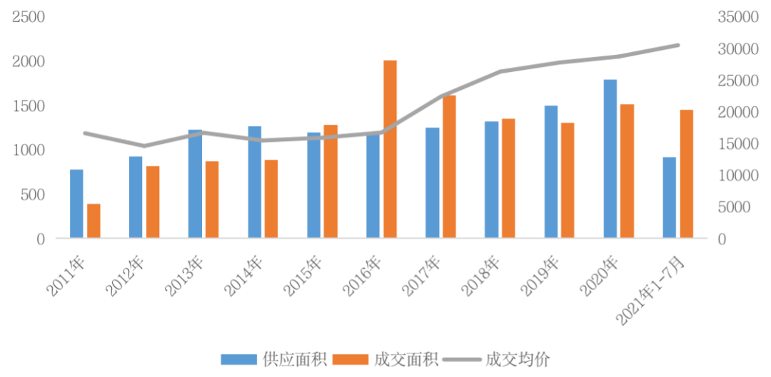 圖:2011年-2021年前7月杭州商品住宅供求量價(單位:萬平方米、元/平方米)