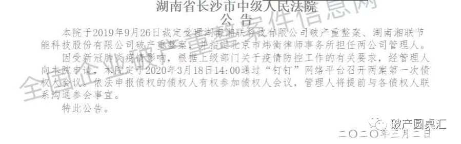 2019年11月,我們團(tuán)隊(duì)被長(zhǎng)沙市中級(jí)人民法院指定為湖南湘聯(lián)節(jié)能科技股份有限公司、湖南湘聯(lián)科技有限公司協(xié)同重整案的破產(chǎn)管理人。受新冠肺炎疫情影響,債權(quán)人復(fù)工時(shí)間不一或多居家避疫,為最大限度減少人員流動(dòng)和聚集,同時(shí)推進(jìn)拯救企業(yè),長(zhǎng)沙中院堅(jiān)持疫情防控和拯救企業(yè)兩手抓、兩手硬,并于3月初決定以網(wǎng)絡(luò)形式合并召開兩案第一次債權(quán)人會(huì)議。筆者作為破產(chǎn)管理人團(tuán)隊(duì)代表,全程與“釘釘”平臺(tái)對(duì)接,協(xié)調(diào)網(wǎng)絡(luò)債權(quán)人會(huì)議各項(xiàng)事務(wù),幸運(yùn)的是,此次債權(quán)人會(huì)議圓滿完成各項(xiàng)議程,達(dá)到預(yù)期效果。