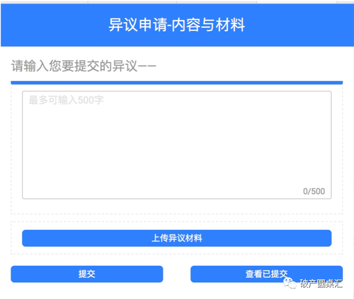 對(duì)債權(quán)表中記載的自己債權(quán)或他人債權(quán)有異議的,債權(quán)人可向管理人提出異議,債權(quán)人可點(diǎn)擊異議鏈接提交異議原因并上傳相關(guān)資料,當(dāng)前異議鏈接僅支持輸入異議原因并上傳相關(guān)資料,不能前置選擇是否存在異議,建議未來(lái)可對(duì)此加以完善,對(duì)異議鏈接可以設(shè)置前置選擇程序,對(duì)自己債權(quán)是否存在異議,如果存在則說明原因并上傳相關(guān)資料,對(duì)他人債權(quán)是否存在異議同理。