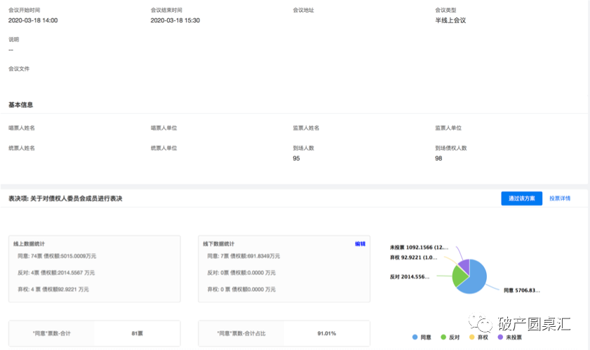 實(shí)務(wù)中線下債權(quán)人會(huì)議簽到也動(dòng)輒需要一個(gè)小時(shí),經(jīng)常是通知九點(diǎn)鐘開會(huì),實(shí)際上簽到結(jié)束后九點(diǎn)半甚至十點(diǎn)才能開會(huì);在統(tǒng)計(jì)表決票時(shí)更覺緊張,需要在短時(shí)間內(nèi)進(jìn)行唱票和計(jì)票完畢,并統(tǒng)計(jì)出結(jié)果。本次債權(quán)人會(huì)議相比省時(shí)省力許多, 14:00準(zhǔn)時(shí)開會(huì),15:00開會(huì)完畢,法官宣布投票之后,短短的5分鐘之內(nèi)便統(tǒng)計(jì)出線上和線下的合計(jì)投票結(jié)果,高效便捷。