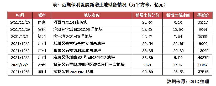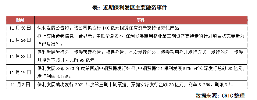 2021年11月融資環(huán)境回暖,央企、地方國企成為了先發(fā)債對象。其中保利發(fā)展11月成功發(fā)行兩筆中期票據,合計規(guī)模為50億元。而臨近11月末,保利發(fā)展先后公告了兩筆融資方案,擬發(fā)行98億元公司債,以及100億元規(guī)模的租賃住房資產支持證券化產品。僅僅11月,保利發(fā)展已發(fā)行及注冊擬發(fā)行的融資規(guī)模就已達到248億。在頻繁融資之后,保利12月在第三輪土拍上頻頻出手,尤其是廣州第三批集中供地投資近百億。