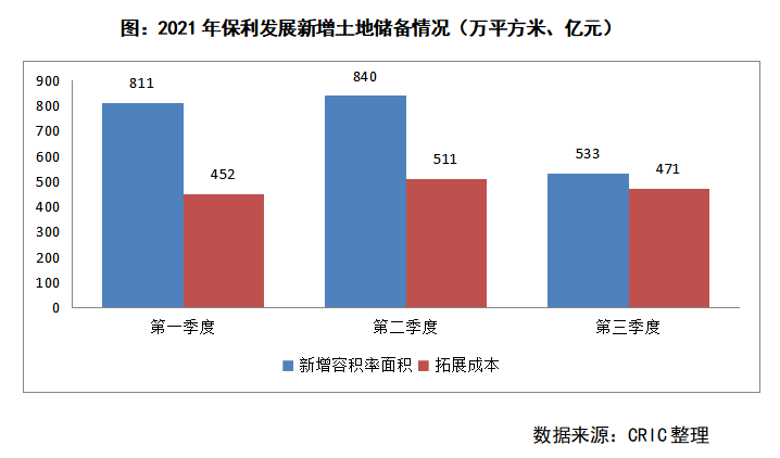 除了借新還舊外,在當前環(huán)境下,保利發(fā)展積極融資也有逆勢超車的意圖。2021年前三季度,保利發(fā)展新拓展項目113個,新增容積率面積2184萬平方米,同比增長10%;總拓展成本1434億元,同比增長9%。其中第三季度在土拍市場較冷,民企受制于還款壓力收縮拿地的背景下,保利發(fā)展繼續(xù)保持較為積極的拿地態(tài)勢,新增容積率面積533萬平方米,總拓展成本471億元。