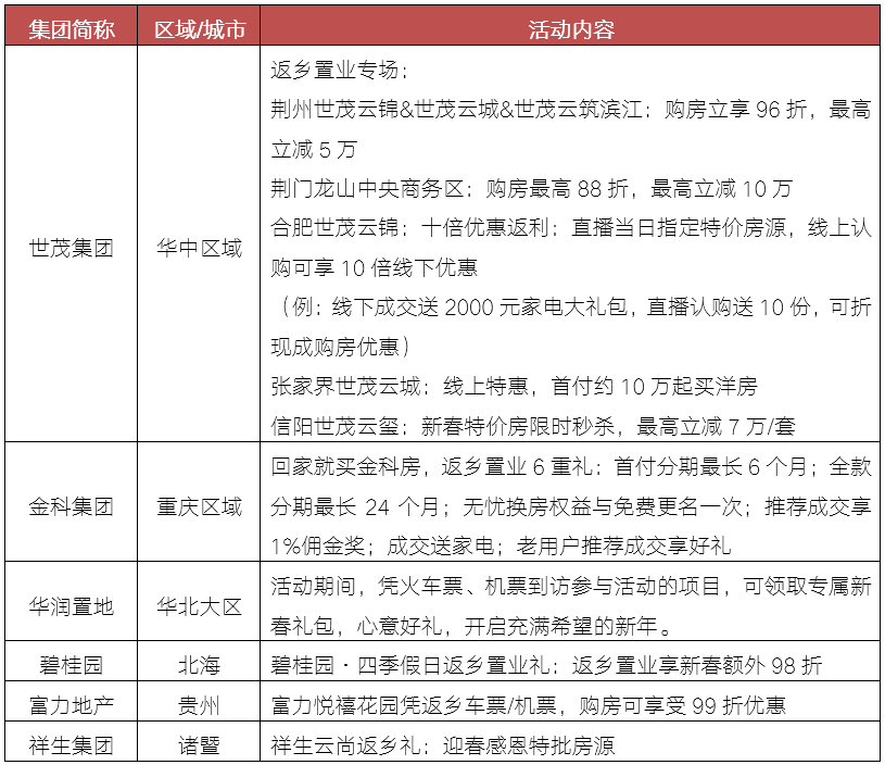 中央號(hào)召“就地過(guò)年”,影響返鄉(xiāng)置業(yè)需求的釋放,不少房企在推廣時(shí)弱化了“返鄉(xiāng)置業(yè)”這一口號(hào)。根據(jù)CRIC監(jiān)測(cè),2021年春節(jié)期間,房企“返鄉(xiāng)置業(yè)”活動(dòng)多數(shù)都是以項(xiàng)目層面推出,TOP30房企中僅有世茂、金科等少數(shù)房企推出了區(qū)域聯(lián)動(dòng)的返鄉(xiāng)活動(dòng)。而促銷方式多以小額現(xiàn)金紅包、車票報(bào)銷等優(yōu)惠為主,部分項(xiàng)目可以憑車票享99折、98折等折扣。比較亮眼的當(dāng)屬世茂華中區(qū)域的返鄉(xiāng)置業(yè)專場(chǎng)直播,活動(dòng)規(guī)模和力度都比較大,如荊門龍門中央商務(wù)區(qū)項(xiàng)目最高可達(dá)88折。