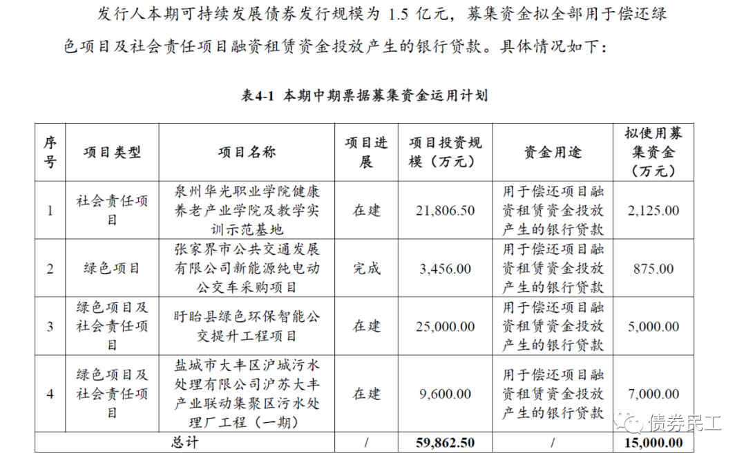 本期債券的發(fā)行規(guī)模為1.5億元,發(fā)行期限為2年。根據(jù)公開(kāi)披露的信息,本次債券的募集資金用途為償還綠色項(xiàng)目及社會(huì)責(zé)任項(xiàng)目融資租賃資金投放產(chǎn)生的銀行貸款,共涉及到4個(gè)項(xiàng)目,分別屬于社會(huì)責(zé)任項(xiàng)目和綠色項(xiàng)目路。與此同時(shí),募集說(shuō)明書同時(shí)披露了4個(gè)募投項(xiàng)目的經(jīng)濟(jì)效益、社會(huì)效益和環(huán)境效益。