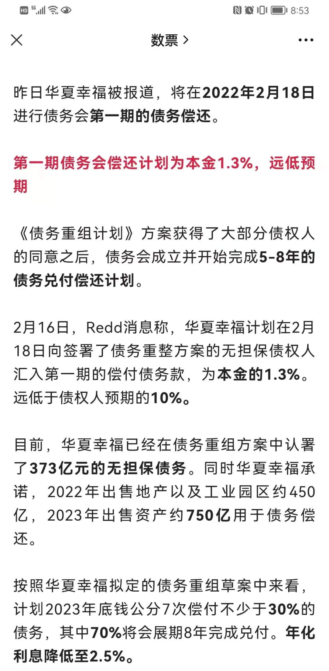 一張來(lái)自有關(guān)自媒體(數(shù)票)總結(jié)歸納的還款計(jì)劃圖,將事情本來(lái)的面貌公之于眾。看完信息之后五味雜陳,對(duì)于華夏幸福而言,此次債務(wù)償還十分不理想;對(duì)于金融機(jī)構(gòu)而言,這樣的還款計(jì)劃只能說(shuō)聊勝于無(wú)。